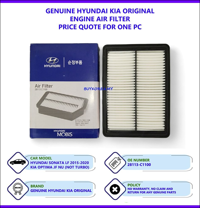 El Filtro de Aire de Motor Hyundai Mobis Original está diseñado para ofrecer un rendimiento excepcional y una protección completa al motor. Su avanzada tecnología de filtración permite una entrada de aire limpia y constante, optimizando la combustión y mejorando la eficiencia del vehículo. Fabricado con materiales de alta calidad, evita el ingreso de polvo e impurezas que pueden dañar el motor. Cumple con los exigentes estándares OEM de Hyundai y Kia, garantizando un ajuste perfecto, larga durabilidad y un desempeño confiable. Ideal para mantener tu motor en óptimas condiciones y prolongar su vida útil.